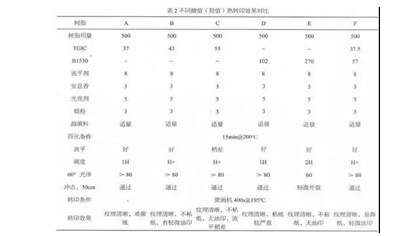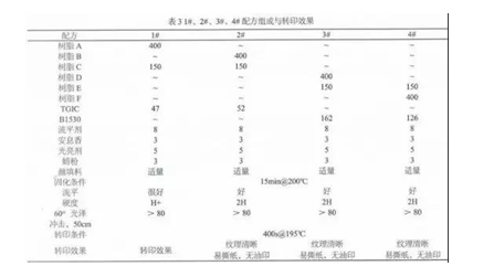 配方2#加入高酸值树脂后转印效果得到改善,流平性好,转印无油印存在。在配方3#,4#中加入部分中羟值的聚氨酯,改善了低轻值聚氨酯固化后涂层粘纸的现象。通过2、3的实验表明,高酸值(羟值)树脂的加入,能有效的提高木纹粉末的交联密度及硬度,从而改善木纹粉末的转印效果。