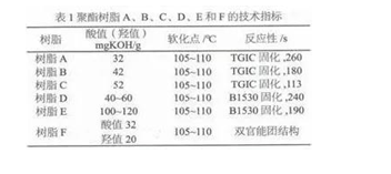 实验选用了三种不同酸值的聚酯树脂(树脂A、B、C)及一个低羟值(树脂D),一个中羟值的聚酯树脂(树脂E),一个端经基一梭基双官能团聚酯树脂(树脂F)。它们的技术指标如表1。