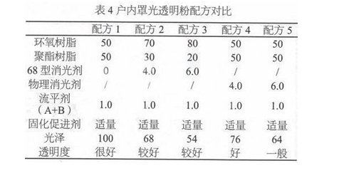 上述配方中流平剂可选用2种的混合,以兼顾罩光透明粉和底粉间的层间附着力和透明度,消光性可选用丙烯酸类代替消光剂或物理型消光剂,经过试验,丙烯酸类消光剂较物理消光剂透明度更佳,消光剂的用量根据光泽选择。