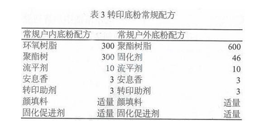 作为罩光透明粉应具备的的条件:①透明度高;②流平性好;③光泽符合要求;④固化条件符合转印木纹油墨的要求。
